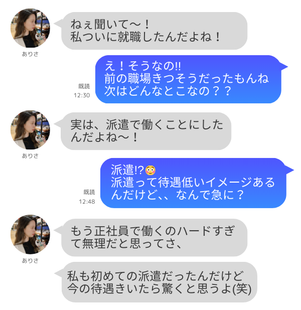 利用者の声2 仕事はしたいけど子育てで時間の都合がつく働き方をしたいな…と相談をしたところ派遣の求人を紹介してくれました。派遣は給料が低く残業が多いとマイナスな印象があったんですが、実際は想像とは真逆!定時で帰れて休みもしっかり取れるので子育てしながらでも無理なく働けています!良さげな条件を色々紹介してくれ、内部事情まで詳しく説明いただけたのであっという間に転職先が決まりました!
