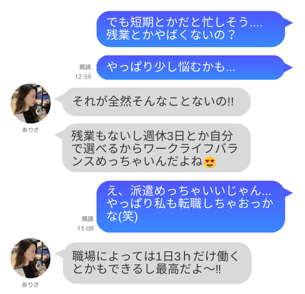 利用者の声1 新卒で正社員として働いたのですが同僚にも恵まれず想像以上の忙しさで挫折、、もう薬剤師自体辞めようと思っていたところ派遣という働き方があることを知りました。 無理のないペースで働ける自分のピッタリのスタイルを見つけられました!なんなら待遇も正社員時代よりあがったので、担当者さんにはとても感謝しています!